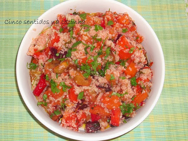 Foi num dos programas do Jamie Oliver do 24Kitchen que vi esta receita de couscous com legumes assados e decidi logo fazê-la não só por ser fácil, mas por me parecer muito boa. Não me desiludi nada, pelo contrário. Este couscous fica muito saboroso. Pode servir como prato principal ou como acompanhamento para carnes. Deixo a sugestão.